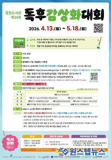 원스텝뉴스 천규영 기자 | 성남도시개발공사 중원도서관은 ‘2026년 도서관의 날·도서관주간’을 맞아 오는 4월 13일부터 5월 18일까지 ‘제24회 독후감상화대회’를 개최한다고 26일 밝혔다.
