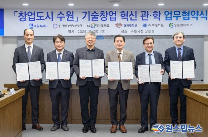 수원시와 경기창조경제혁신센터, 4개 대학은 30일 시청 상황실에서 ‘창업도시 수원 기술창업 혁신 관·학 업무협약’을 체결하고, 협력을 약속했다.