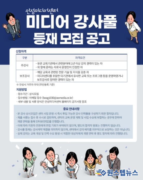 원스텝뉴스 이병희 기자 | 안성시는 4월 1일부터 보다 체계적이고 전문적인 미디어 교육 운영을 위해 ‘미디어 강사풀’ 등재 강사를 상시 모집한다.