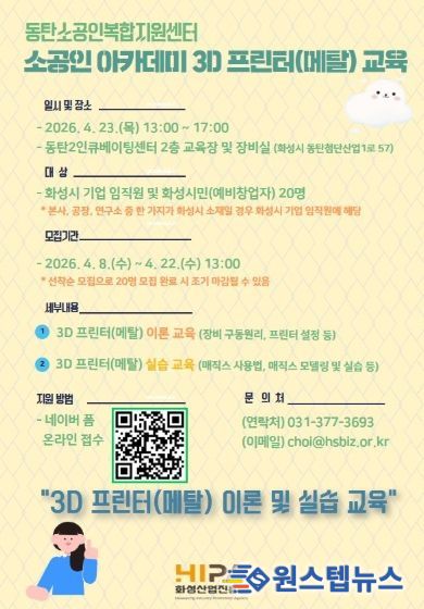 1회차 교육은 4월 23일 동탄 소공인복합지원센터에서 운영되며, ▲3D 프린터(메탈) ▲ 매직스 및 전처리 등의 주제로 이론과 실습을 병행해 수강생들의 현업 적용을 지원할 예정이다.