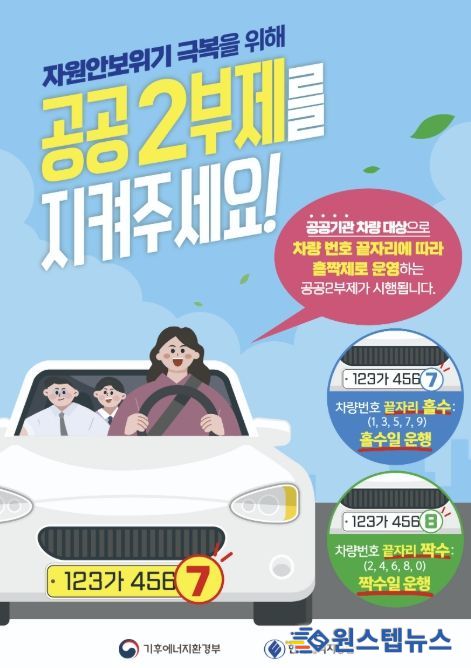 정부는 4월 8일부터 공공기관 승용차 5부제를 2부제(홀짝제)로 강화해 시행하고 있다. 차량 번호판 끝자리가 홀수이면 홀수일, 짝수이면 짝수일에만 운행할 수 있으며, 토요일·일요일과 공휴일은 제외된다. 또한 공공기관이 운영하는 공영주차장에는 승용차 5부제가 별도로 적용된다.
