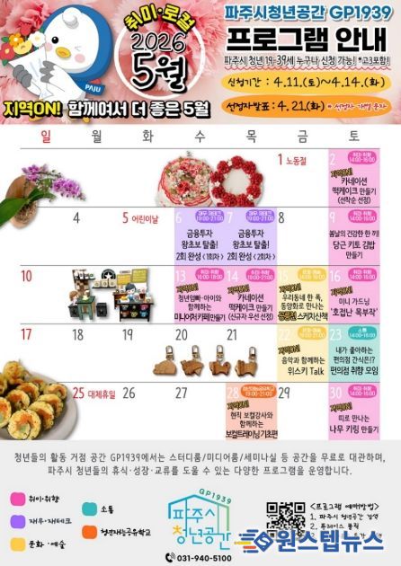 파주시 관계자는 "5월 프로그램은 가정의 달을 맞아 청년들이 함께 만들고 배우며 교류할 수 있도록 구성했다”라며 “앞으로도 청년들이 지피(GP)1939에서 휴식과 성장, 교류를 함께 누릴 수 있도록 다양한 프로그램을 지속 운영하겠다”라고 말했다.