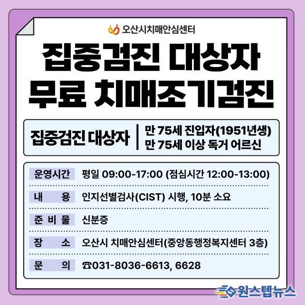 원스텝뉴스 이병희 기자 | 오산시치매안심센터는 치매의 조기 발견과 예방적 관리를 위해 관내 만 75세 진입자(1951년생) 및 만 75세 이상 독거 어르신을 대상으로 치매 집중검진을 실시한다고 밝혔다.