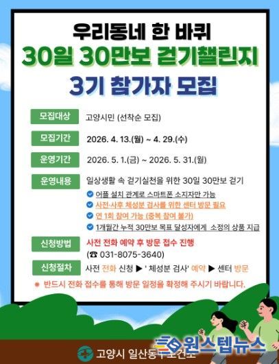 원스텝뉴스 이병희 기자 | 고양특례시 일산동구보건소는‘우리동네 한 바퀴 30일 30만보 걷기 챌린지’ 3기 참가자를 오는 13일부터 모집한다. 해당 프로그램은 지역 주민의 기초 체력 증진과 일상 속 신체활동 활성화를 위해 진행한다.
