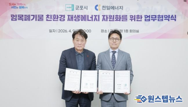 원스텝뉴스 이병희 기자 | 군포시는 도시숲·가로수 등의 조성 및 관리 사업 중 발생하는 미이용 산림 산물을 친환경 재생에너지로 자원화하여 폐기물 처리 비용을 절감하고 탄소중립 실현에 기여할 수 있도록 4월 9일 시청 1층 회의실에서 ㈜천일에너지와 업무협약을 체결했다.