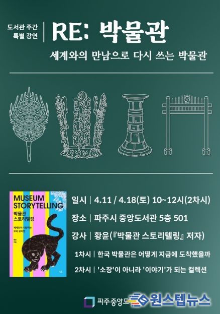 원스텝뉴스 이병희 기자 | 파주중앙도서관은 도서관 주간을 맞아 오는 4월 11일과 18일 토요일 10시, 특별 강연 ‘리(RE): 박물관-세계와의 만남으로 다시 쓰는 박물관’을 운영한다.