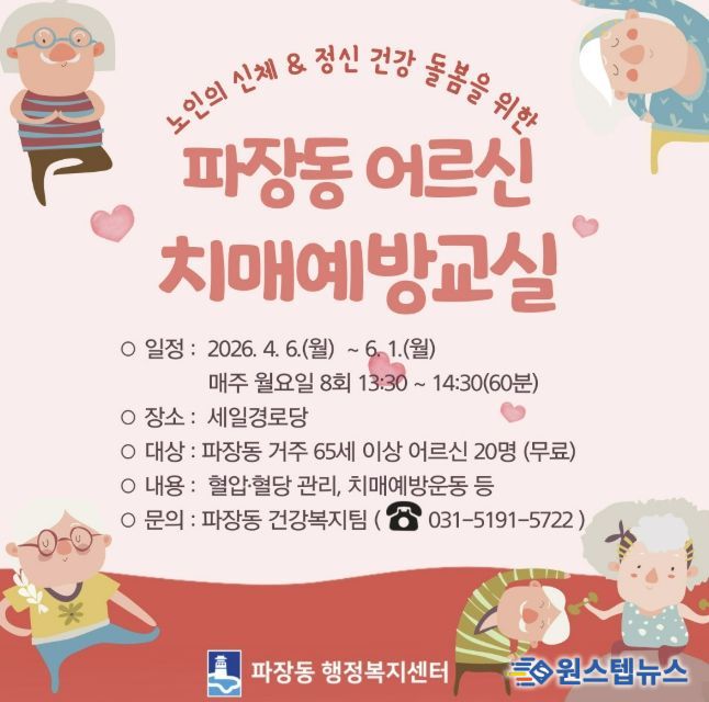 원스텝뉴스 이병희 기자 | 수원시 장안구 파장동은 관내 어르신들의 신체 및 정신건강 돌봄을 위해 ‘2026년 파장동 어르신 치매예방교실’을 장안구보건소 치매안심센터와 협업하여 운영한다고 밝혔다.