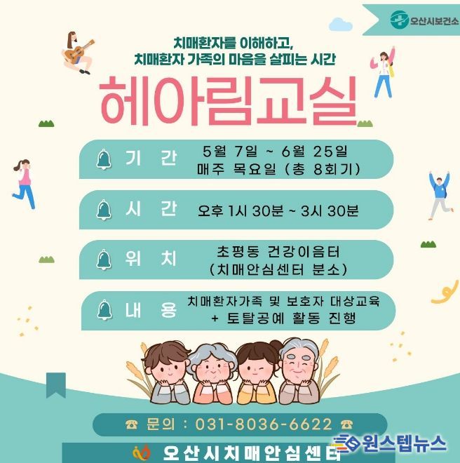 원스텝뉴스 이병희 기자 | 오산시치매안심센터는 치매 환자와 가족의 정서적 부담을 완화하고 돌봄 역량 강화를 지원하기 위해 치매 가족 대상 프로그램 '헤아림 교실' 2기 참여자를 모집한다고 밝혔다.