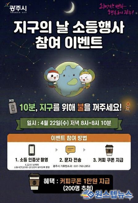 원스텝뉴스 천규영 기자 | 광주시는 제56주년 지구의 날(4월 22일)을 기념해 당일 10분간 진행하는 소등 행사와 연계한 시민참여 온라인 행사를 추진한다고 14일 밝혔다.