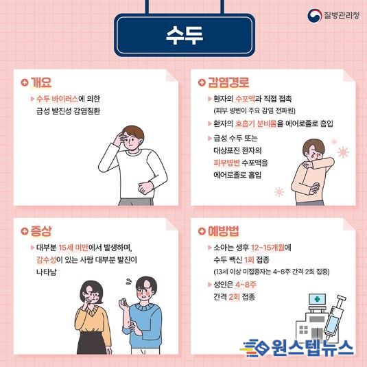 수두 예방을 위해서는 ▲30초 이상 손 씻기 ▲기침 시 옷소매로 입과 코 가리기 ▲주기적으로 실내 환기하기 등 개인 예방수칙 준수가 가장 중요하며, 발진 1~2일 전부터 전염기에 해당해 집단 내 유행 시 마스크 착용을 권고한다.