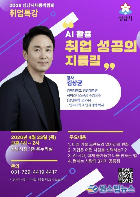 이날 오후 1시 시청 1층 온누리실에서는 경희대학교 경영대학원 김상균 교수가 ‘AI 활용, 취업 성공의 지름길’을 주제로 미래 기술 트렌드와 일자리 변화에 대응하는 AI 기반 취업 준비 전략을 제시하는 특강을 진행한다.