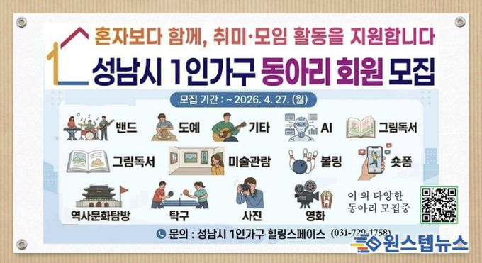 원스텝뉴스 이병희 기자 | 성남시는 같은 취미를 가진 1인 가구들로 구성된 동아리에 연간 최대 70만원의 활동비를 지원한다고 15일 밝혔다.