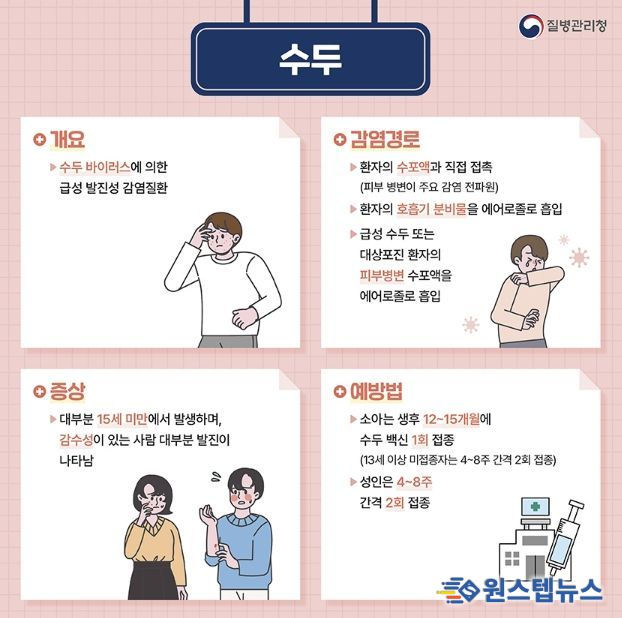 수두는 수두ㆍ대상포진 바이러스에 의해 발생하는 급성 발진성 감염병으로, 발열과 함께 전신에 가려움을 동반한 물집성 발진이 나타나는 것이 특징이다. 기침이나 재채기를 통한 비말과 수포액 접촉 등을 통해 쉽게 전파되며, 전염력이 강해 어린이집과 유치원, 학교 등 집단생활 시설을 중심으로 확산할 가능성이 높다.