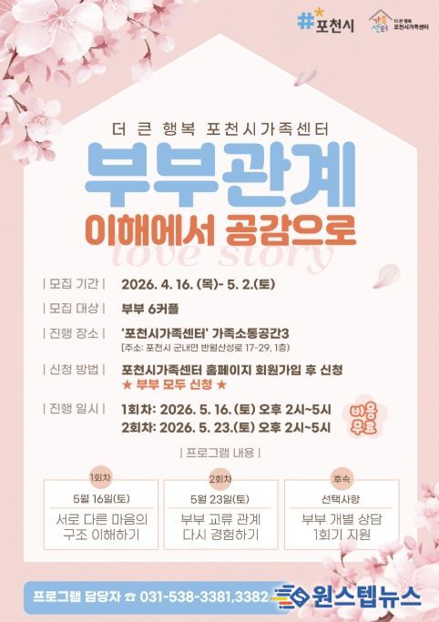 원스텝뉴스 이병희 기자 | 포천시 직영 더 큰 행복 포천시가족센터는 건강한 부부 관계 형성과 가족 기능 강화를 위해 부부 대상 프로그램 ‘부부 관계 이해에서 공감으로’ 참여자를 모집한다.