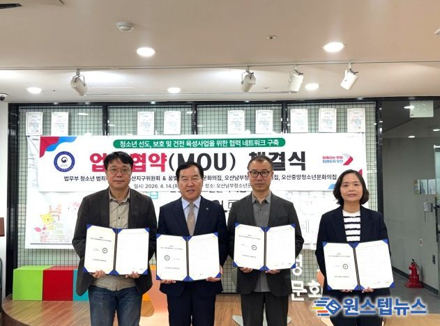 원스텝뉴스 이병희 기자 | 법무부 청소년범죄예방위원 오산지구위원회는 지난 14일 오산남부청소년문화의집에서 오산남부청소년문화의집, 꿈빛나래청소년문화의집, 오산중앙청소년문화의집과 청소년 협력사업 추진을 위한 업무협약(MOU)을 체결했다고 밝혔다.