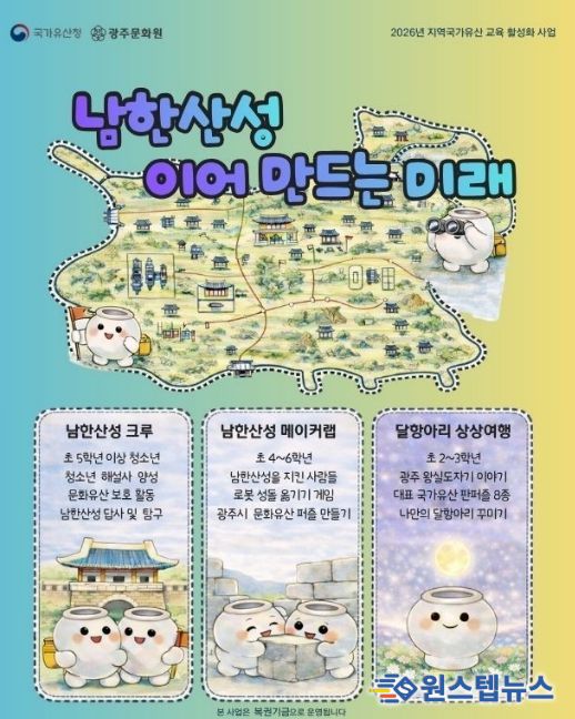 원스텝뉴스 이병희 기자 | 광주시는 국가유산청 공모사업인 ‘2026년 지역국가유산 교육 활성화 사업’에 선정되어 광주문화원이 시행하는 ‘남한산성, 이어 만드는 미래’를 4월말부터 본격 운영할 예정이다.