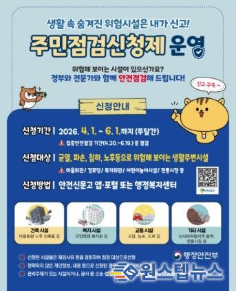 시 관계자는 “주민점검신청제는 시민의 눈높이에서 위험 요소를 제거할 수 있는 소중한 기회”라며, “시민 여러분의 작은 관심이 큰 사고를 막는 첫걸음인 만큼 적극적인 관심과 참여를 부탁드린다”라고 말했다.