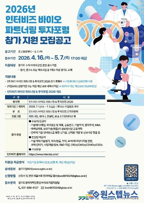 원스텝뉴스 이병희 기자 | 경기도는 (재)경기도경제과학진흥원과 함께 도내 바이오·제약 기업의 기술사업화와 투자 활성화를 지원하기 위해 ‘인터비즈 바이오 파트너링&투자포럼 2026’에 참가할 기업을 모집한다.