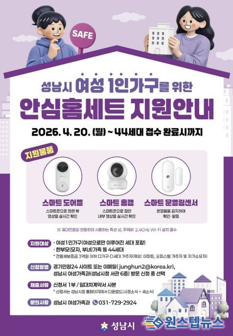 원스텝뉴스 이병희 기자 | 성남시는 여성 1인 가구의 범죄예방과 안전한 주거생활을 위해 ‘안심 홈세트 3종’을 지원한다고 16일 밝혔다.