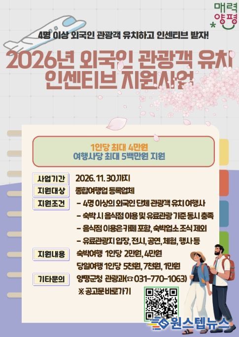 원스텝뉴스 이병희 기자 | 양평군은 외국인 관광객 유치를 촉진하고 침체된 지역 관광산업에 활력을 불어넣기 위해 ‘2026년 양평군 외국인 관광객 유치 인센티브 지원사업’을 추진한다고 밝혔다.