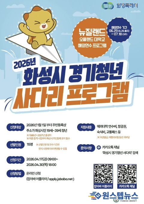 원스텝뉴스 이병희 기자 | 화성특례시는 해외 연수를 희망하는 청년들에게 경제적 부담 없이 글로벌 경험을 쌓을 수 있는 ‘화성시 경기청년 사다리 프로그램’(운영기관: 평택대학교 산학협력단) 2기 참여자를 모집한다.