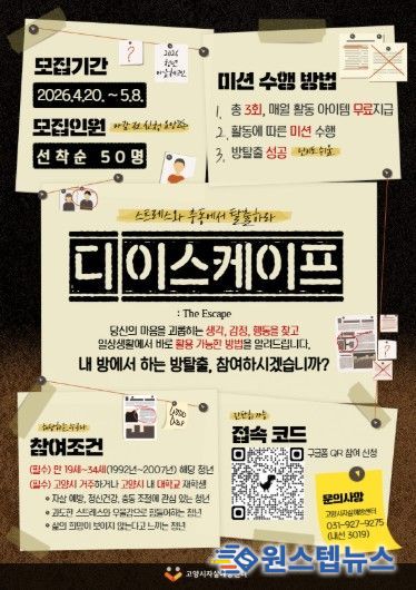 원스텝뉴스 이병희 기자 | 고양특례시 자살예방센터는 우울, 스트레스, 충동 등으로 어려움을 겪거나 삶이 막막하게 느껴지는 청년들의 정신건강 증진과 자살 예방을 위해 ‘청년마음체크인’비대면 체험형 프로그램 ‘디 이스케이프’ 참여자를 모집한다.