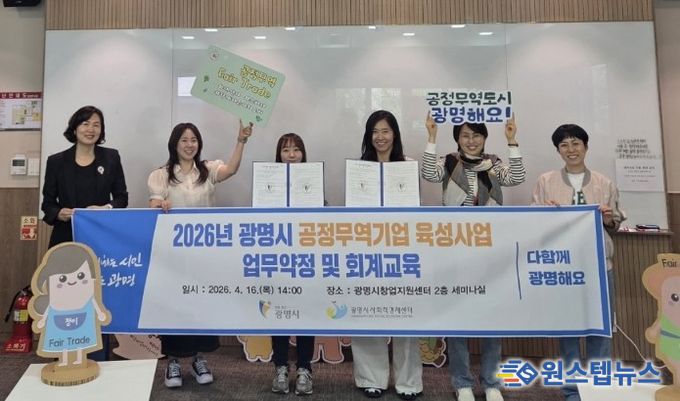 시는 16일 창업지원센터에서 ‘2026년 공정무역기업 육성사업’ 선정기업인 ㈜워킹앤츠, 광명장애인보호작업장과 업무약정식을 열었다.