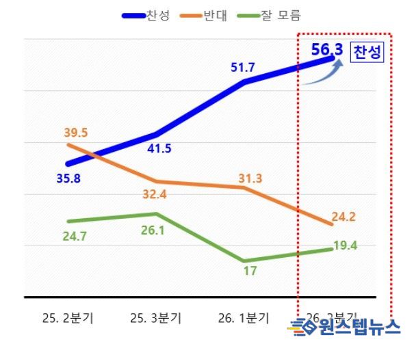 수원 군공항 이전에 대한 화성시민 찬성 비율은 꾸준히 상승하고 있다. 언론사 여론조사 결과에 따르면 ‘찬성’ 비율은 2025년 6월 35.8%, 9월 41.5%, 2026년 1월 51.7%, 4월 56.3%였다. 이번 조사에서는 찬성, 반대 격차가 32.1%까지 벌어졌다.