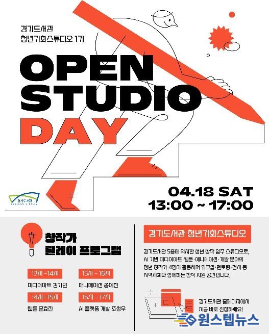 원스텝뉴스 천규영 기자 | 경기도서관이 오는 18일 도내 청년 창작가들의 작업 공간인 ‘청년기회스튜디오’를 도민에게 공개하고 작가들과 직접 소통하는 ‘오픈 스튜디오 데이’를 개최한다.