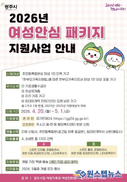 원스텝뉴스 이병희 기자 | 광주시는 여성 1인 가구와 한부모가족의 생활 안전 강화를 위해 ‘여성 안심 종합 지원사업’ 대상자 35가구를 오는 20일부터 5월 1일까지 모집한다고 17일 밝혔다.