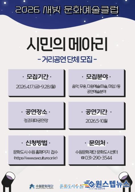 원스텝뉴스 이병희 기자 | 수원문화재단은 지역 공연예술의 활성화와 수원시민의 주체적 문화예술 참여를 위해 ‘새빛 문화예술클럽 '시민의 메아리'’ 사업에 참여할 생활예술단체를 모집한다.
