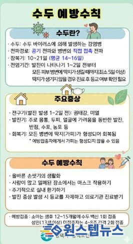 수두는 전염력이 높은 감염병으로, 단체생활을 하는 아동·청소년층에서 쉽게 확산될 수 있다. 따라서 발열이나 발진 등 의심 증상이 있을 경우 조기에 진료를 받고, 발진 발생 후 최소 5일간은 등원·등교 및 단체활동을 자제하는 것이 중요하다.