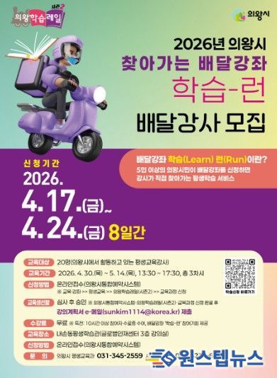 원스텝뉴스 이병희 기자 | 의왕시가 시민이 원하는 시간과 장소에 강사를 파견하는 맞춤형 평생학습 서비스인‘2026년 찾아가는 배달 강좌 학습-런(Run)’사업에 활동할 역량 있는 시민을 모집한다.