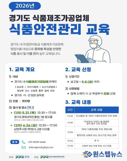원스텝뉴스 이병희 기자 | 경기도는 도내 식품제조·가공업체의 자율적 위생관리 역량을 강화하기 위해 ‘도내 식품제조·가공업체 위생관리 교육’ 참여자를 모집한다고 20일 밝혔다.