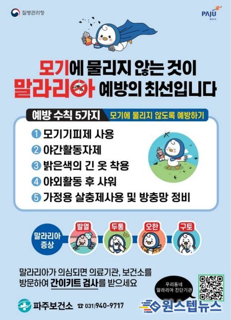 이한상 파주보건소장은 “발열이나 오한 등 감기 증상이 나타날 경우, 가까운 말라리아 진단기관이나 보건소를 방문해 신속히 검사받는 것이 중요하다”라며 “앞으로도 촘촘한 감염병 안전망을 구축해 시민의 건강과 일상을 안전하게 지켜나가겠다”라고 강조했다.