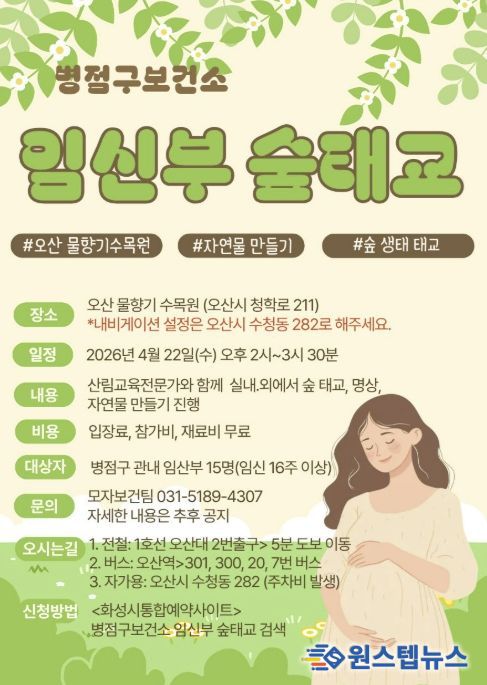 원스텝뉴스 이병희 기자 | 화성특례시 병점구보건소는 임신부의 정서적 안정과 건강한 출산을 지원하기 위해 오는 22일 ‘임신부 숲태교 프로그램’을 운영한다고 밝혔다.