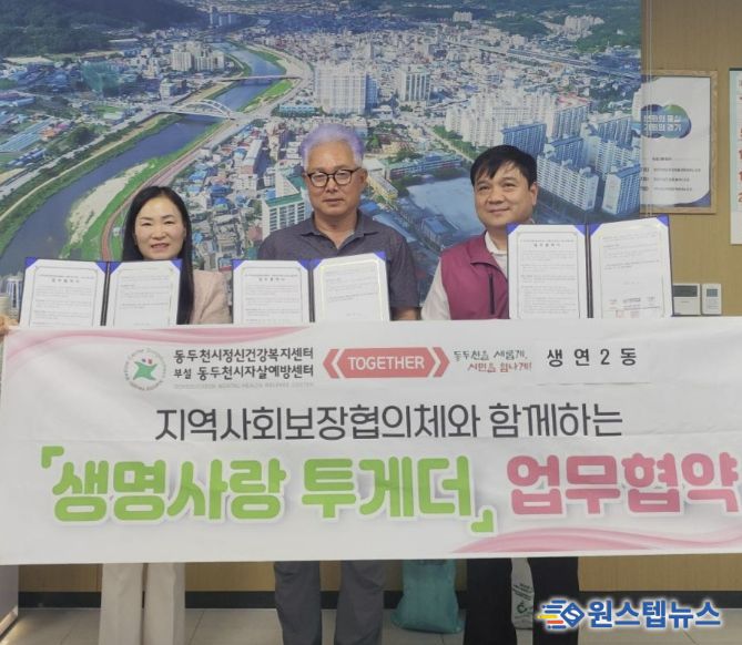 원스텝뉴스 이병희 기자 | 동두천시정신건강복지센터 부설 자살예방센터는 ‘생명사랑 투게더’사업 추진을 위해 지난 17일, 생연2동 행정복지센터 및 생연2동 지역사회보장협의체와 업무협약을 체결했다.