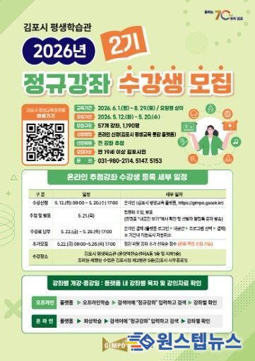 원스텝뉴스 천규영 기자 | 김포시가 시민의 평생학습 참여 기회를 확대하고 변화하는 사회 환경에 대응할 수 있는 역량 강화를 위해 ‘2026년 2기 평생교육 정규강좌’ 수강생을 모집한다고 밝혔다.