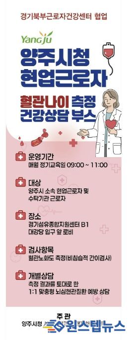 원스텝뉴스 이병희 기자 | 양주시가 현업근로자의 건강 증진과 뇌심혈관계질환 예방을 위해 오는 4월 22일부터 연말까지 ‘찾아가는 근로자 건강상담 부스’를 운영한다.