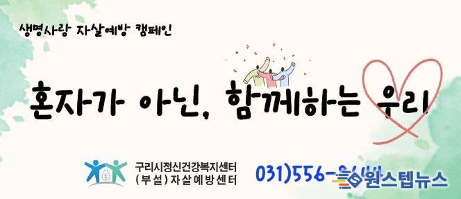 원스텝뉴스 이병희 기자 | 구리시는 자살률이 증가하는 3월부터 5월까지를 ‘생명 사랑 자살 예방 집중 홍보 기간’으로 지정하고, 시민의 소중한 생명을 보호하기 위한 예방 활동을 적극 추진하고 있다고 밝혔다.