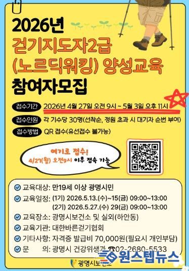 나기효 건강위생과장은 “이번 교육은 단순한 신체 활동을 넘어 시민 건강 회복과 지역사회 건강 공동체 활성화에 기여하는 뜻깊은 기회가 될 것”이라며 “걷기에 관심 있는 시민들의 적극적인 참여를 기대한다”고 밝혔다.