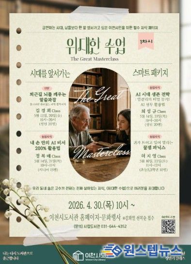 원스텝뉴스 천규영 기자 | 이천시립도서관은 오는 4월 30일부터 2026년 상반기 시민강사 프로그램 ‘위대한 수업’의 1차 수강생을 모집한다고 밝혔다.