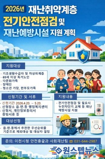 원스텝뉴스 이병희 기자 | 이천시는 전기설비 노후화 등으로 인한 화재와 안전사고를 예방하고 재난취약계층의 주거 안전을 강화하기 위해 ‘재난취약계층 전기안전점검 및 재난예방시설 지원사업’을 추진한다고 밝혔다.