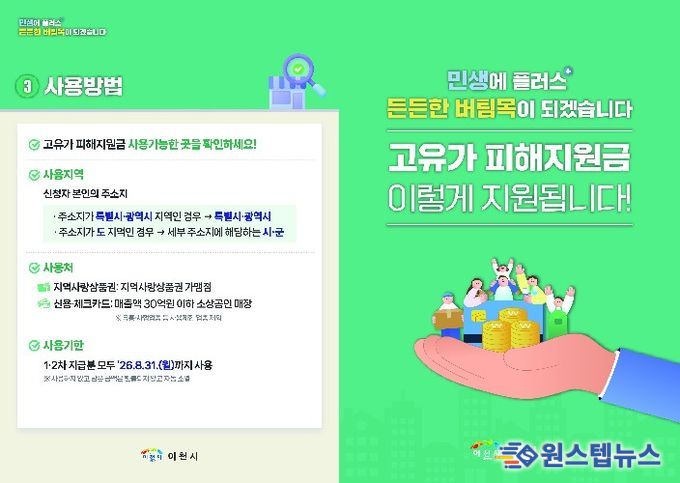 이천시 복지정책과장은 “신속한 지급을 통해 고유가로 어려움을 겪는 시민들의 부담을 덜고, 지역경제 회복에 실질적인 도움이 될 수 있도록 최선을 다하겠다”라고 말했다. 이어 “정부와 카드사, 지역화폐 운영기관은 스미싱 피해 예방을 위해 피해지원금 관련 안내 문자나 사회관계망서비스(SNS)에 링크를 포함해 발송하지 않을 예정”이라며, 관련 문자에 대한 각별한 주의를 당부했다.