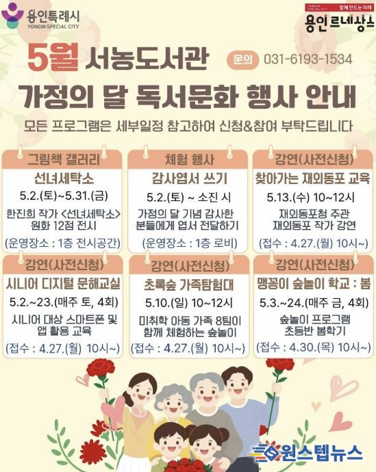 원스텝뉴스 천규영 기자 | 용인특례시 서농도서관은 오는 5월 가정의 달을 맞아 다양한 세대를 아우르는 프로그램으로 이뤄진 ‘2026년 5월 독서문화행사’를 마련했다고 21일 밝혔다.