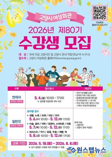 원스텝뉴스 이병희 기자 | 고양특례시 여성회관은 오는 5월 4일부터 12일까지 2026년 제80기 정규강좌 수강생을 모집한다.