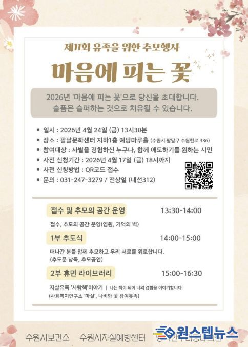 원스텝뉴스 천규영 기자 | 수원시자살예방센터가 24일 오후 1시 30분 팔달문화센터 예당마루홀에서 유족을 위한 추모행사 ‘제11회 마음에 피는 꽃’을 연다.