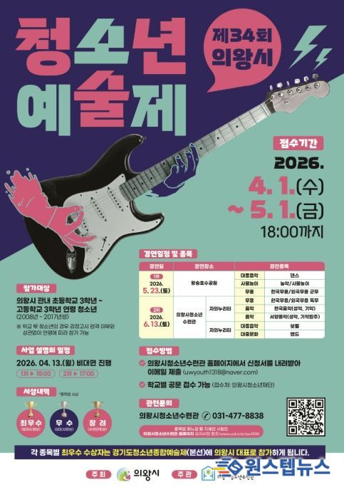 장원호 의왕시청소년예술제 담당자는 “청소년들이 주도적으로 참여하는 예술 활동을 통해 자신의 재능을 마음껏 펼칠 수 있는 기회가 되길 바란다”며 “관내 청소년들의 많은 관심과 참여를 기대한다”고 전했다.