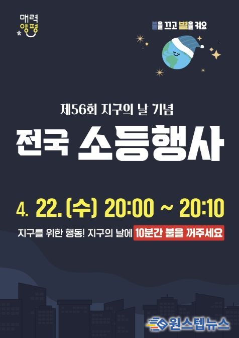 특히 지구의 날 당일인 22일 오후 8시부터 10분간 전 군민이 참여하는 ‘소등 행사’가 진행된다. 양평군청을 비롯한 관내 공공기관은 전면 소등에 참여하고, 공동주택과 일반 가정에서도 자율적으로 동참할 수 있도록 할 계획이다.