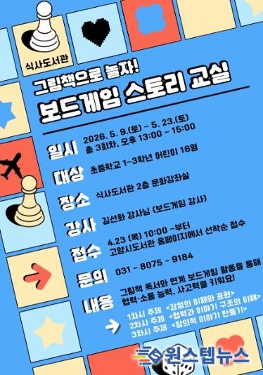 원스텝뉴스 천규영 기자 | 고양특례시 식사도서관이 오는 5월 9일부터 공공도서관 독서문화 프로그램 ‘그림책으로 놀자! 보드게임 스토리 교실’을 운영한다.